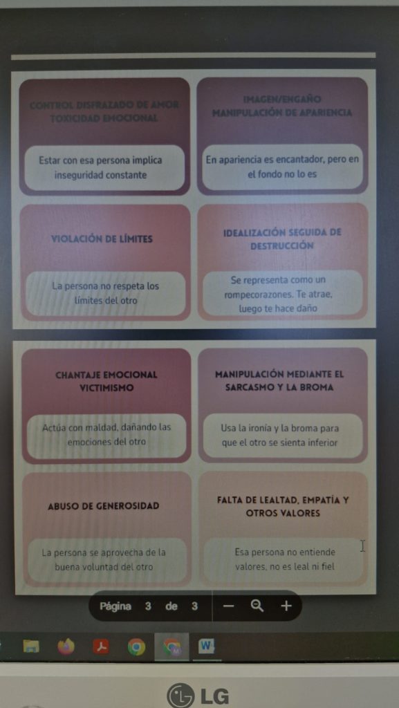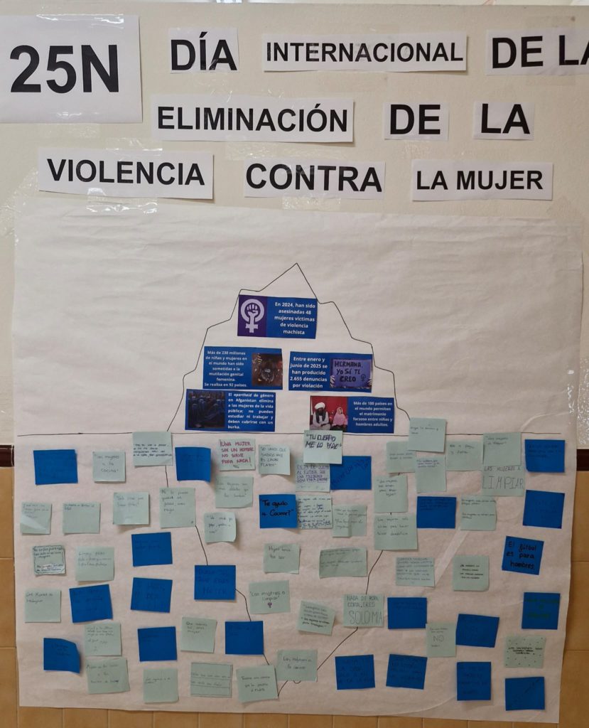 Durante la última semana se ha trabajado en la prevención de la violencia machista a través de diferentes actividades en el centro. Desde las tutorías se ha reflexionado sobre el uso de expresiones, bromas y situaciones cotidianas que repercuten en la perpetuación de la violencia contra la mujer. Se ha representado a través de un iceberg colaborativo, con las aportaciones de todo el alumnado. Además, en la asignatura Aprendizaje Social y Emocional, el alumnado de 4º B ha realizado una exposición de fotografías sobre violencia machista. En atención educativa, el alumnado de 3º ha realizado la grabación de un Podcast sobre esta temática, para dar a conocer el origen de este día y expresar sus impresiones. Por último, el alumnado de 2º, en atención educativa ha analizado la letra de la canción “La Perla” de Rosalía para detectar expresiones de manipulación emocional en las relaciones de pareja.