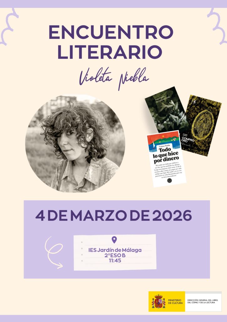 El pasado 4 de marzo el alumnado de 2°ESO B disfrutó de un encuentro literario con la escritora Violeta Niebla, quien compartió con ellos su pasión por la literatura y el proceso creativo que hay detrás de sus obras. Nos habló sobre sus libros, explicando el origen de sus historias y los temas que la motivan a escribir. Con un lenguaje cercano, desveló cómo encuentra la inspiración en la vida cotidiana.