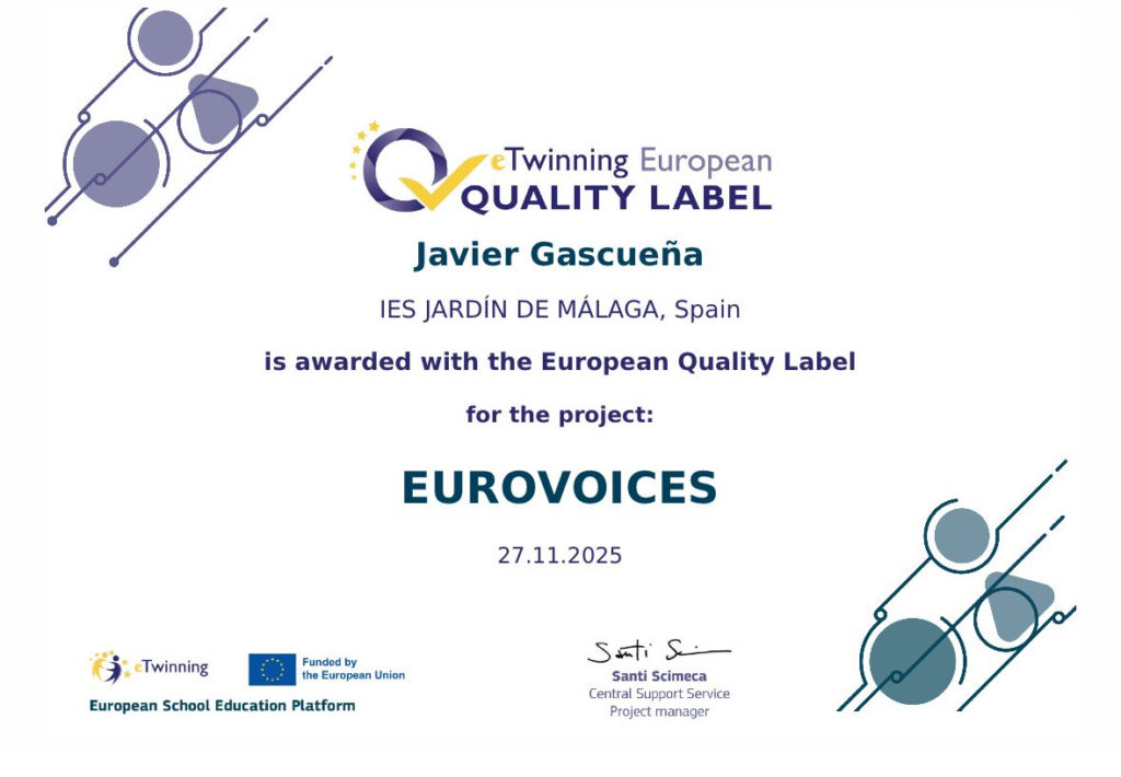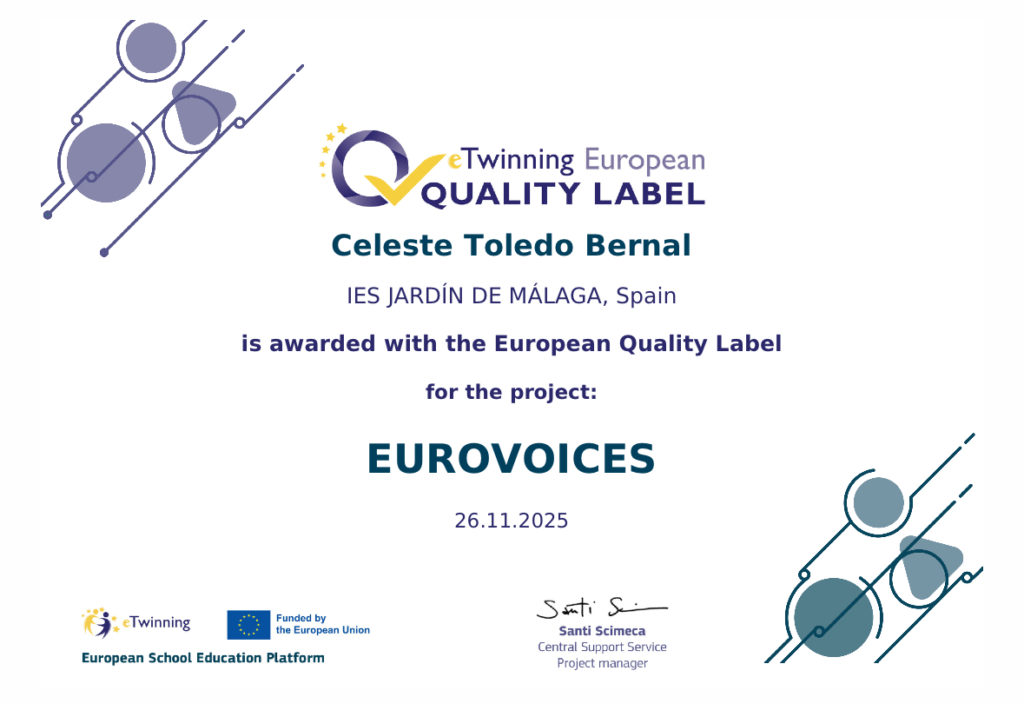 La comisión europea ha otorgado Sello de Calidad Europeo al proyecto EUROVOICES, realizado por nuestro alumnado de 3º y 4º de ESO del curso pasado. Este distintivo valora aspectos como la innovación pedagógica, el buen uso de la tecnología, la calidad de los productos finales o la colaboración entre los centros participantes. En EUROVOICES, creamos un programa de radio en inglés en torno a los Objetivos de Desarrollo Sostenible. Puedes escuchar los podcasts y saber más sobre el desarrollo del proyecto en su web: